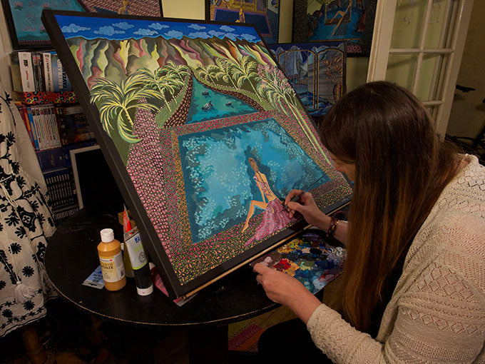 Aujourd'hui, mes pinceaux glissent sur des toiles, sur lesquelles je compose des paysages empreints d'une aura résolument "zen". J'y intègre avec passion des structures architecturales qui leur confèrent une profondeur tridimensionnelle, tout en agrémentant ces scènes de mes personnages aux traits distinctifs. Chacune de mes créations s'érige en un véritable "Tableau joaillerie", orné d'un subtil équilibre entre 80% de gouache et 20% acrylique.