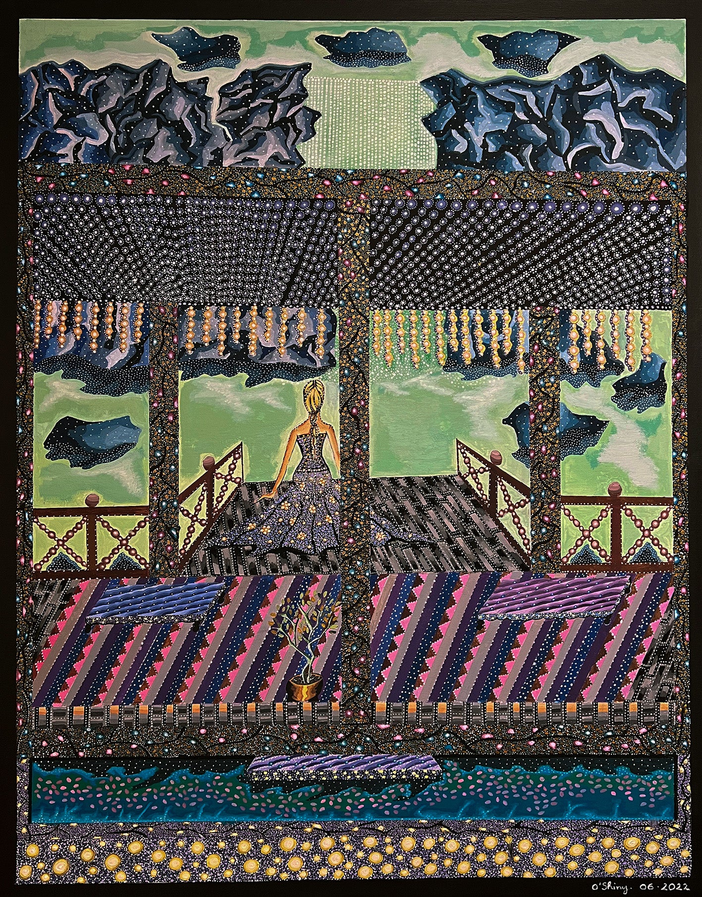 Envolée spirituelle part 2" est une exploration introspective qui s'inspire des montagnes et de l'eau, tout en utilisant la technique de la gouache et du pointillisme pour apporter une profondeur et une subtilité au tableau. Tel un sommet majestueux qui se dresse devant nous, ce voyage intérieur conduit à une transformation profonde de l'être, où les différentes nuances et dégradés de couleurs évoquent la richesse de l'expérience.