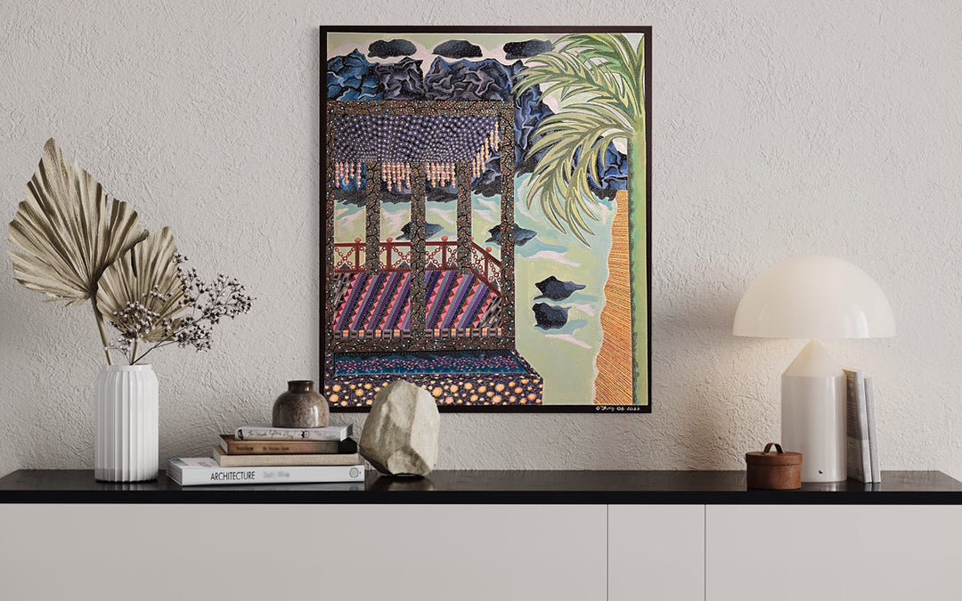 "Envolée spirituelle part 3" est un parcours intérieur qui explore la voie de la sérénité profonde et du vide intérieur à travers la méditation. Tel un palmier qui s'élève majestueusement vers le ciel, ce voyage symbolise l'importance de l'abondance et la recherche du nirvana.
